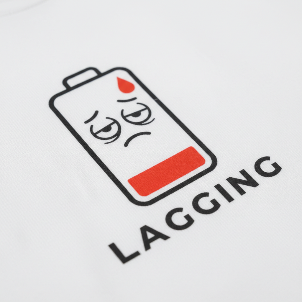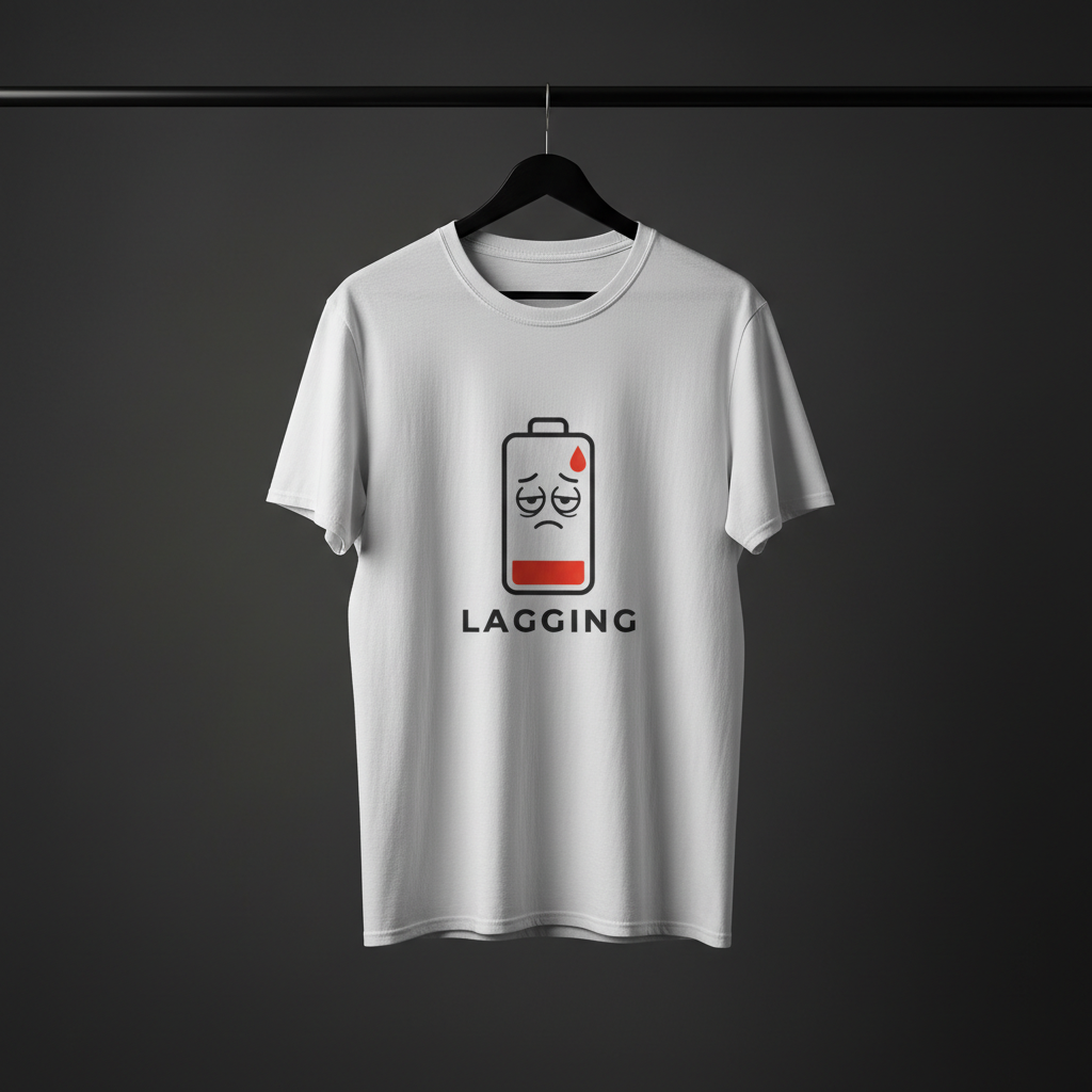 This design humorously captures the feeling of low energy and digital sluggishness.